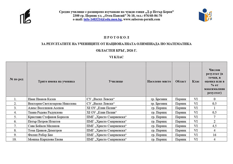 Предоставяме на Вашето внимание резултатите от областния кръг на олимпиадата по математика за учебната 2025/2026 година – IV, V и VI клас.